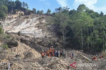 Anggota tim SAR melakukan pencarian korban tanah longsor di Perumahan Matauli, Pandan, Tapanuli Tengah, Sumatera Utara, Sabtu (6/12/2025). ANTARA FOTO/Muhammad Adimaja/rwa.